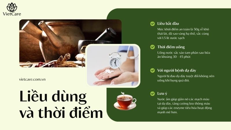 | Đối tượng sử dụng | Liều lượng (Rễ khô) | Lượng nước sắc | Thời điểm uống tốt nhất |