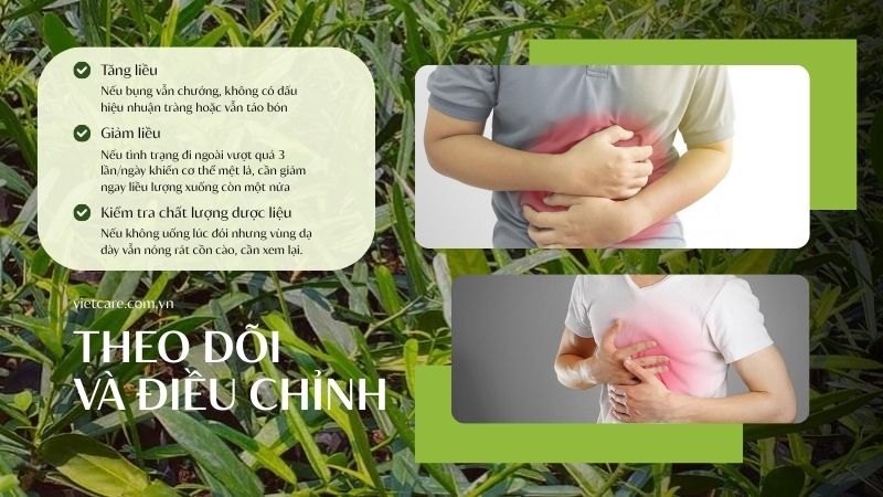 Bạn cũng cần quan sát màu sắc của nước tiểu và phân để đánh giá hiệu quả thực tế. Khi hệ tiêu hóa và gan hoạt động tốt nhờ xáo tam phân, nước tiểu sẽ trong hơn và phân sẽ vào khuôn, có màu vàng tươi thay vì màu đen hoặc xanh như trước. Nếu các triệu chứng đau bụng giảm dần, ăn uống ngon miệng và ngủ sâu giấc, hãy duy trì liều lượng hiện tại.