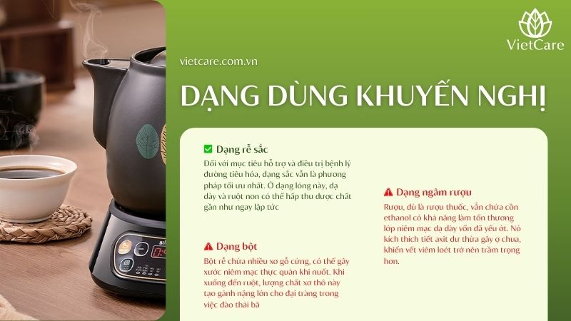 Khi xuống đến ruột, lượng chất xơ thô này tạo gánh nặng lớn cho đại tràng trong việc đào thải bã. Nước sắc là dạng tinh khiết nhất, đã loại bỏ phần bã thô, giữ lại tinh túy dược chất. Để đạt hiệu quả cao nhất, bạn nên chọn mua loại rễ nguyên bản, về tự sao vàng và sắc uống trong ngày. Nên giữ nước trong bình ủ nhiệt để duy trì độ ấm nóng, tránh việc đun đi đun lại nhiều lần làm mất chất.